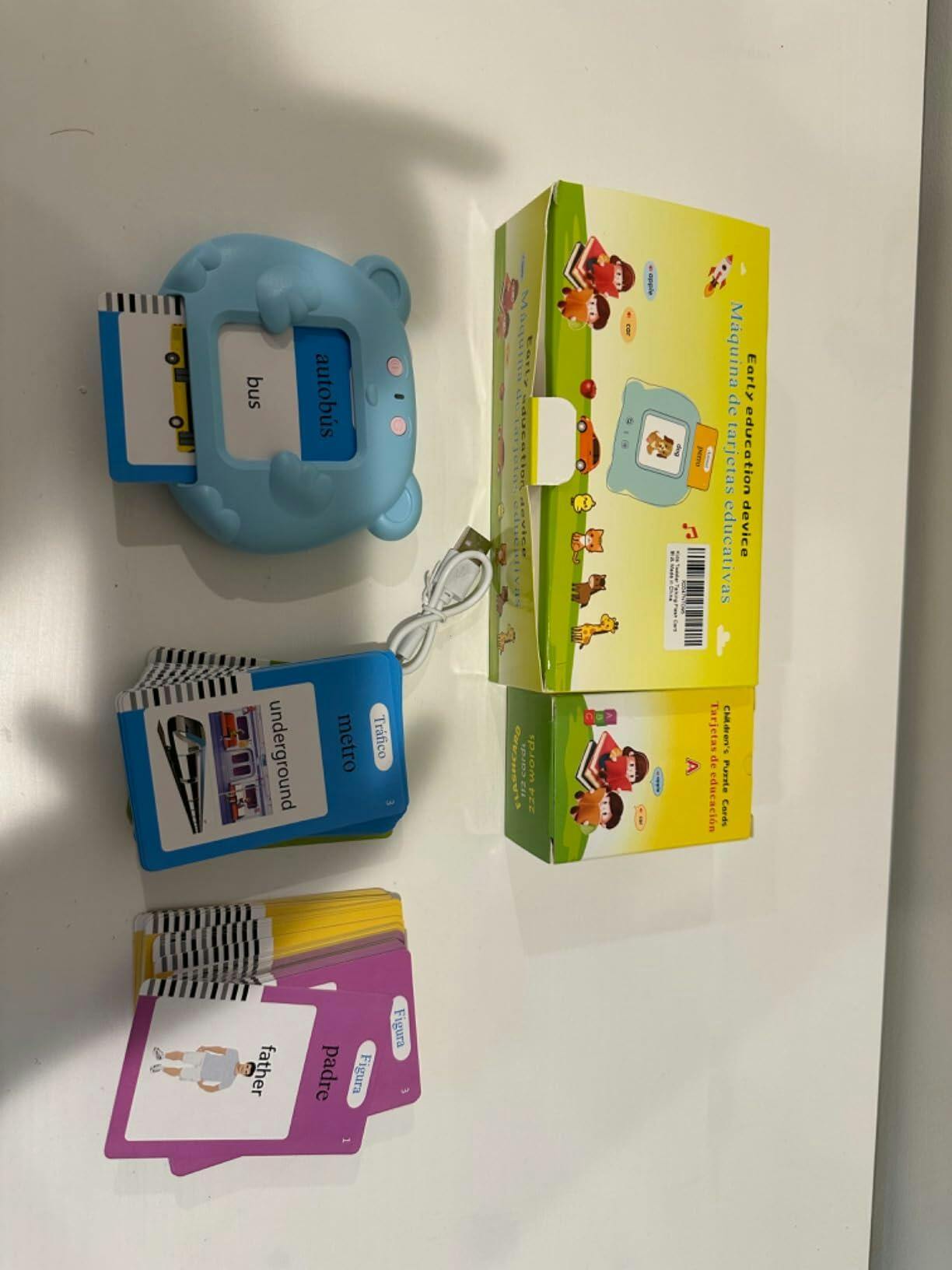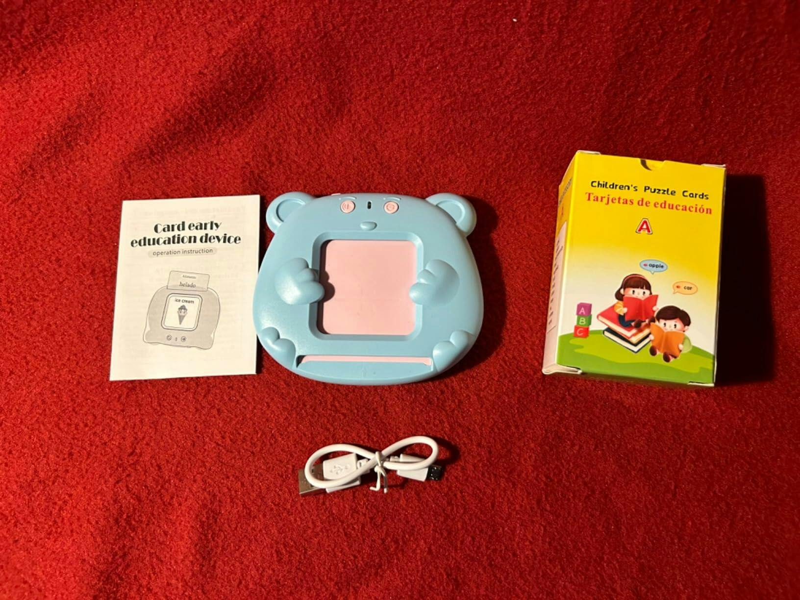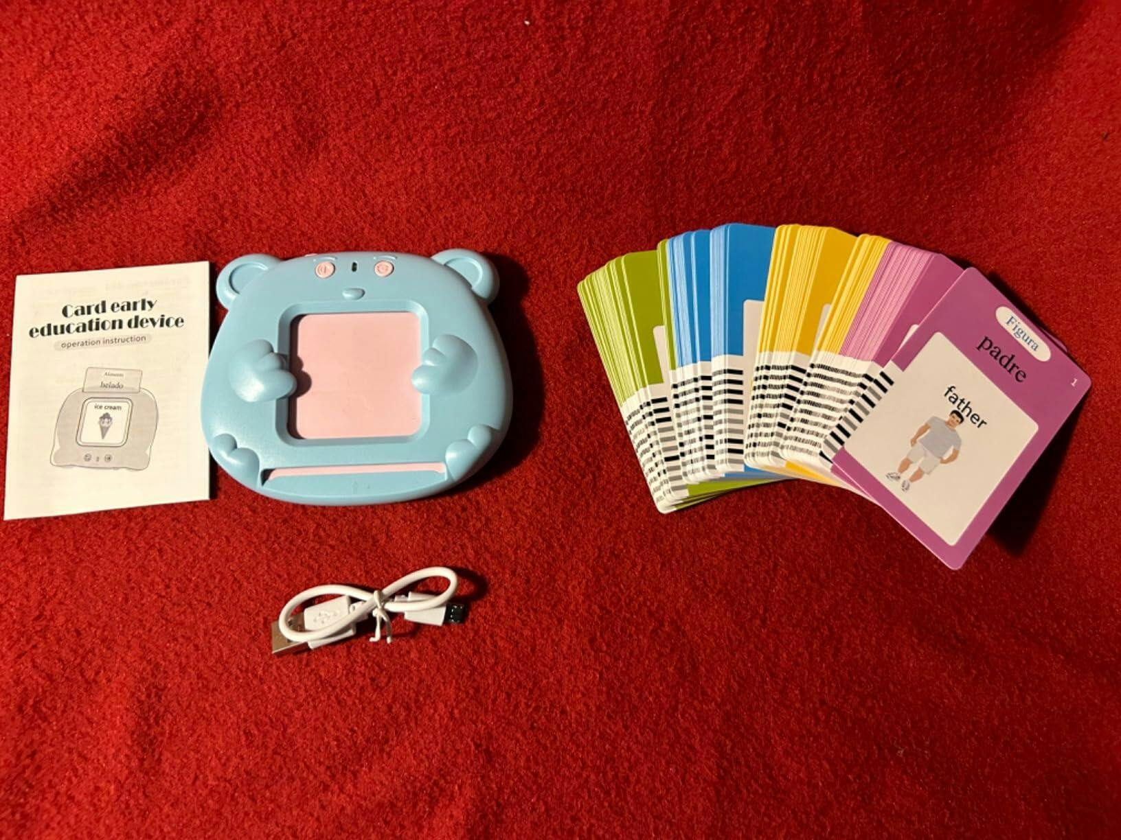 Liraaz flash cards set includes 1 card reader, double-sided 112 flash cards with a total of 224 words, 1 USB charging cable, and 1 instruction manual.